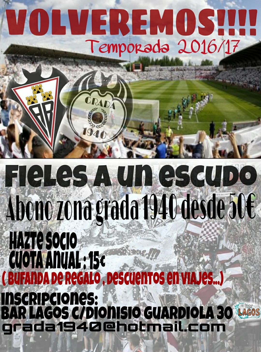 La Grada 1940 está de vuelta y ha dado a conocer su campaña de captación de socios. El abono se puede conseguir por solo 50 euros, mientras la cuota anual de socio asciende a 15 euros. Las inscripciones se pueden hacer en el Bar Lagos de la calle Dionisio Guardiola núm. 30.