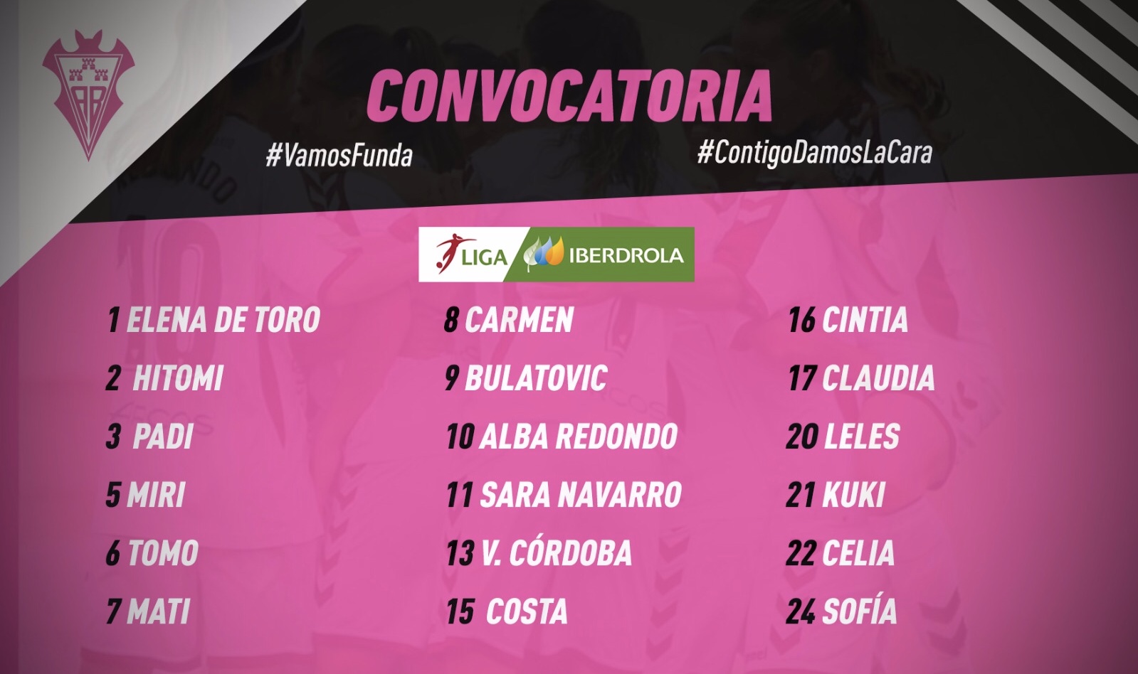 El cuerpo técnico del Fundación Albacete Femenino ha convocado a 18 jugadoras para el partido que mañana disputará el equipo ante el Rayo Vallecano Femenino en la ciudad deportiva vallecana a partir de las 16:30 horas.
