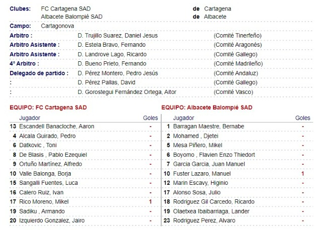 Trujillo Suárez volvió a completar otra pésima tarde a nivel arbitral en un partido sin apenas complicaciones y donde volvió a evidenciar sus carencias. Pudo influir de manera directa en el marcador equivocándose gravemente en la jugada que acaba en el 1-0 a favor del Cartagena. Un evidente saque de banda a la altura del medio campo a favor del Albacete, fue ‘regalado’ a los locales que trenzaron una jugada hasta el golazo de Mikel Rico que no debió subir al marcador tras el grave error de los colegiados.