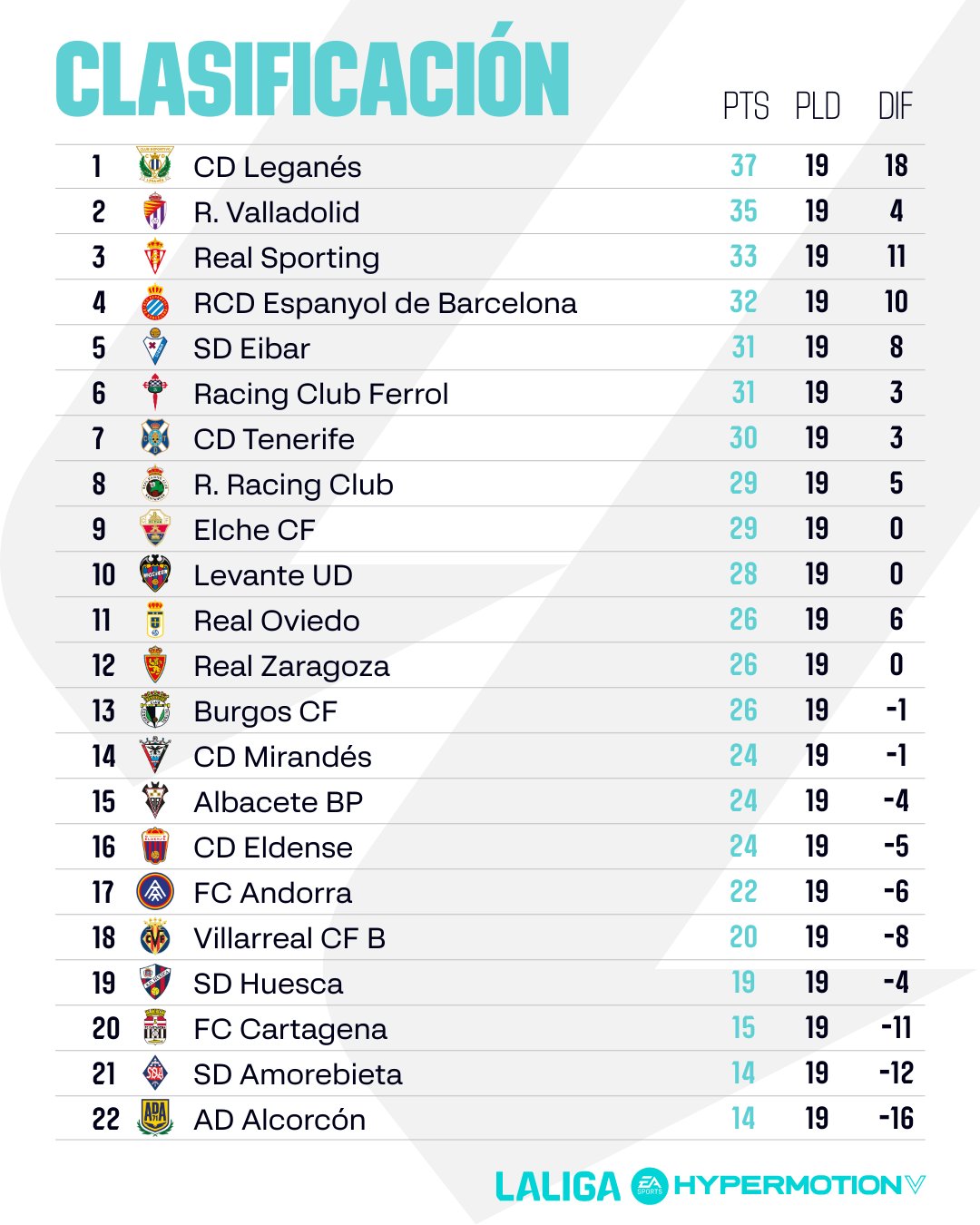 El único capaz de ganar de los equipos de play off ha sido el Valladolid, que remontó al Amorebieta por 2-1. El líder Leganés empató 1-1 frente al Eldense mientras que el Espanyol hizo lo propio ante el Zaragoza. La jornada ha contabilizado más empates como los 0-0 del Sporting – Levante y Burgos – Mirandés de la jornada sabatina.
