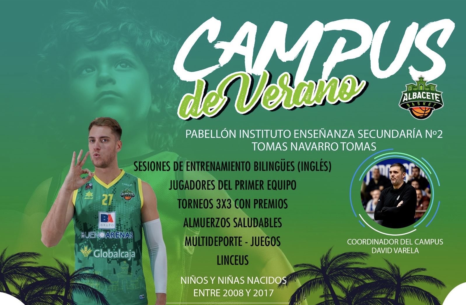 El CAMPUS DE VERANO ALBACETE BASKET se celebrara entre los días 25 y 29 de Junio, en el Pabellón Polideportivo IES Tomas Navarro Tomas, en Avd. España frente al Campo del de Futbol del Carlos Belmonte, en los horarios de mañana de 9:00 a 14:00 y dirigido a niños y niñas de entre 6 y 18 años, con un precio de 85€, quedándose en 75€ para los socios y su familias, para participantes del Campus de Navidad y para los jugadores ya pertenecientes a equipos de cantera del Albacete Basket y un descuento de 5€ por segundo hermano. Las inscripciones se podrán hacer a través de albacetebasket.es/inscripciones.