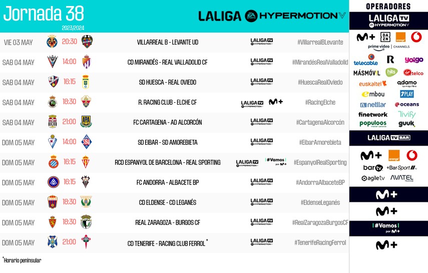 ha publicado los horarios de la jornada 38 de LALIGA HYPERMOTION, que comenzará el viernes 3 de mayo con el encuentro entre Villarreal B y Levante UD a partir de las 20:30h., y finalizará el domingo 5 de mayo con el CD Tenerife – Racing Club de Ferrol a las 21:00h. (horario peninsular).