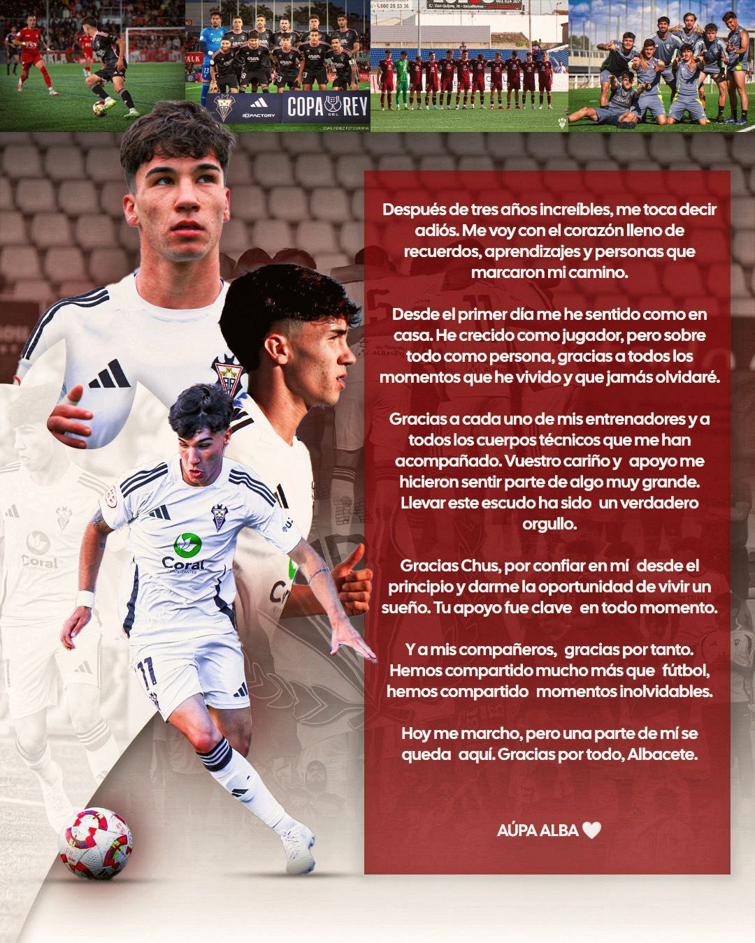 «Hoy me marcho pero una parte de mí se queda aquí. Gracias por todo, Albacete»– decía el joven centrocampista que se suma a una ya larga lista de canteranos que deciden salir del club más representativo de Castilla-La Mancha.