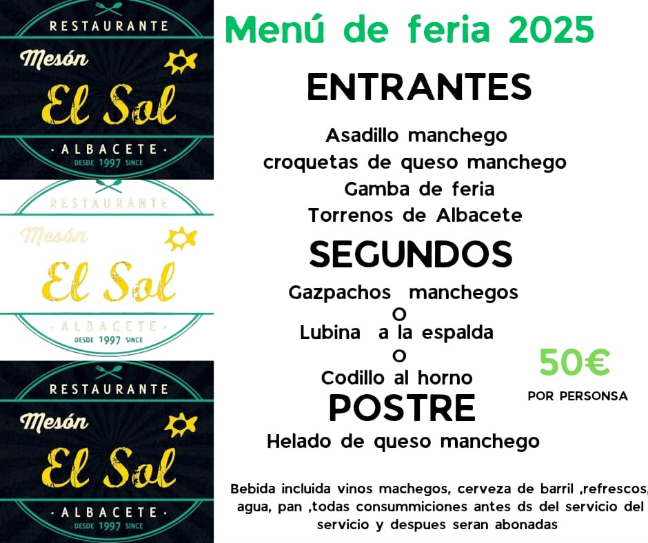 Con menú diario, menús para grupos en sus amplios y renovados salones, una extensa carta de vinos, los mejores arroces y ensaladas, carnes, pescados y productos con el ‘toque personal’, para poder acabar las comidas y cenas con sus postres, ahora desde Mesón El Sol trabajan ya preparando la Feria de Albacete.