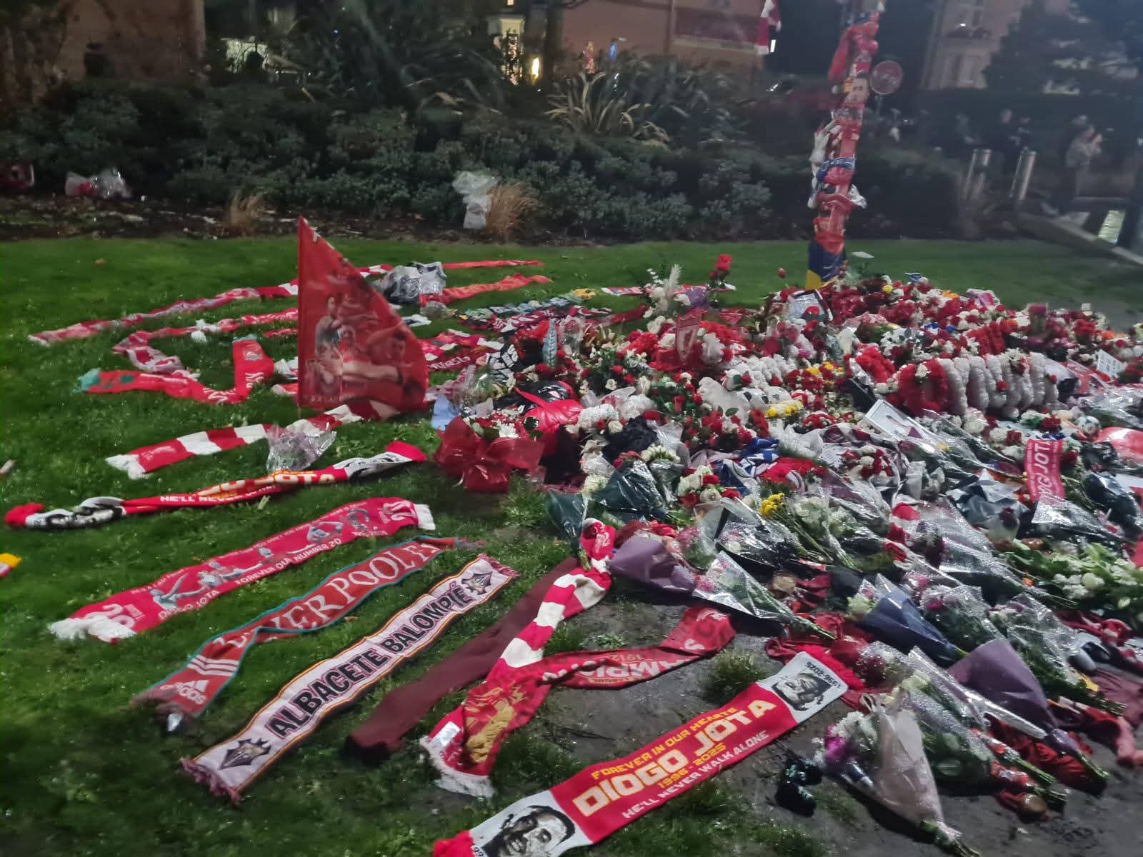 El futbolista portugués falleció el pasado 4 de julio en un trágico accidente de tráfico en Portugal, una noticia que sacudió por completo al mundo del fútbol. Jota, habitual en los onces del Liverpool y figura de la selección lusa, dejó un vacío inmenso entre compañeros, aficionados y amantes de este deporte. Desde entonces, en el exterior del estadio inglés se ha creado un rincón muy especial: un altar improvisado lleno de flores, camisetas, banderas y bufandas de clubes de todo el mundo en memoria del delantero.