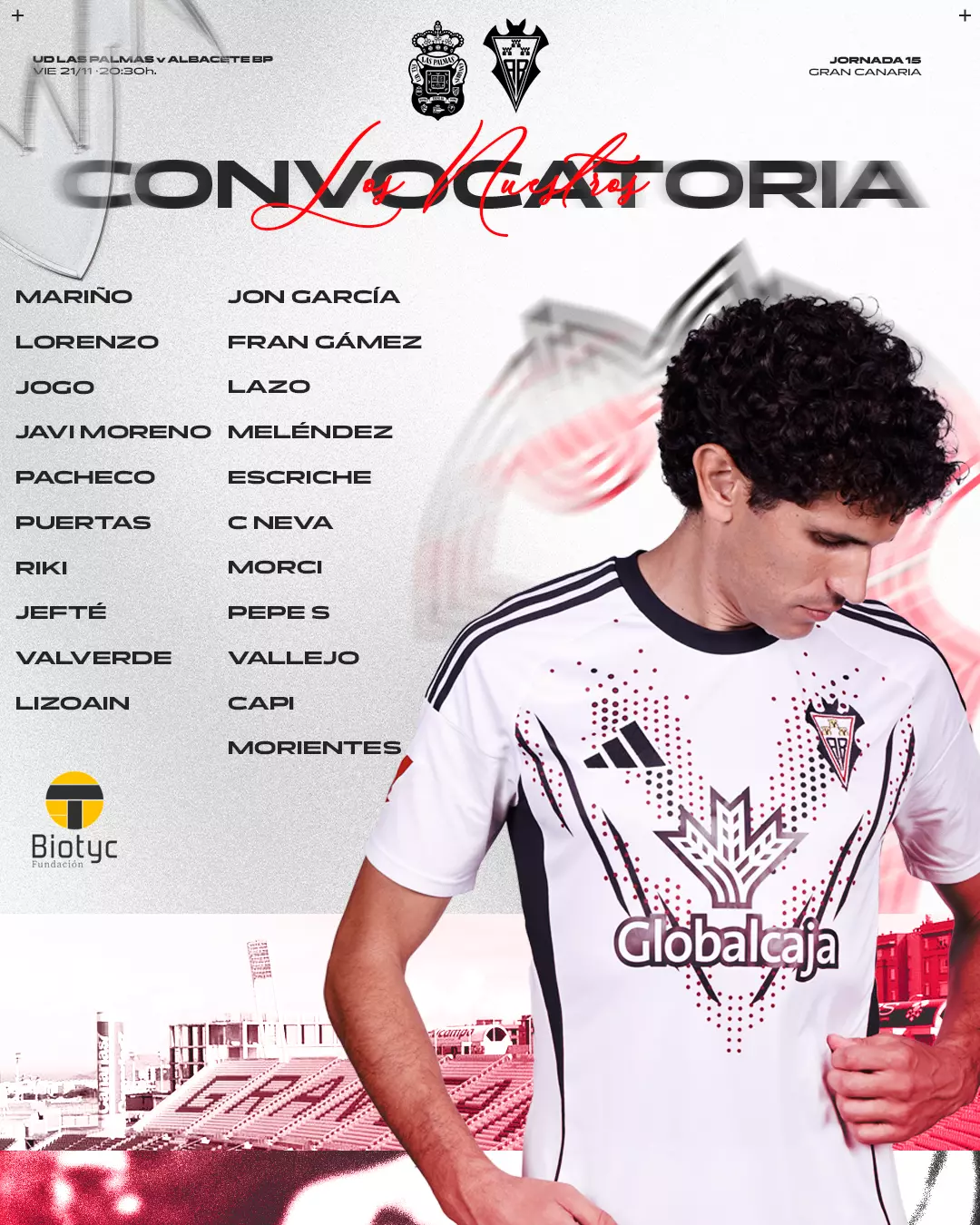 La lista para dicho encuentro está compuesta por 21 jugadores, con las ausencias por lesión de Javi Villar, Higinio Marín y Agus Medina pero la incorporación del atacante sonsecano y canterano Alberto Morientes, máximo goleador del Atlético Albacete junto al regreso de Pepe Sánchez y Puertas.