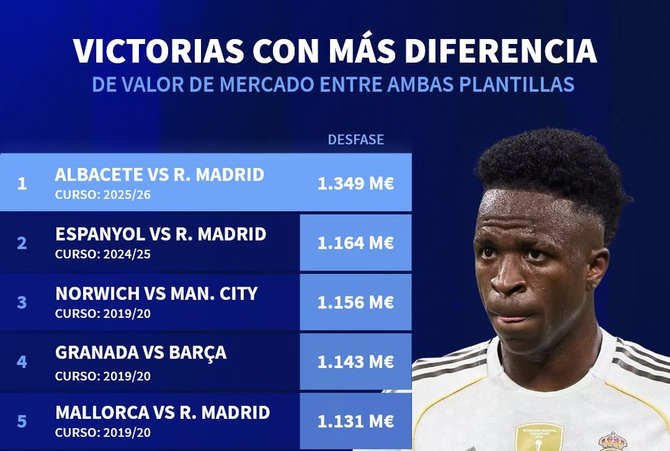 Este triunfo supera incluso al hasta ahora récord ostentado por el RCD Espanyol, que la pasada temporada venció al Real Madrid en LaLiga con una diferencia de valor entre plantillas de 1.164,45 millones de euros. Completa el podio histórico la victoria del Norwich City sobre el Manchester City de Guardiola (3-2) en la temporada 2019/20.