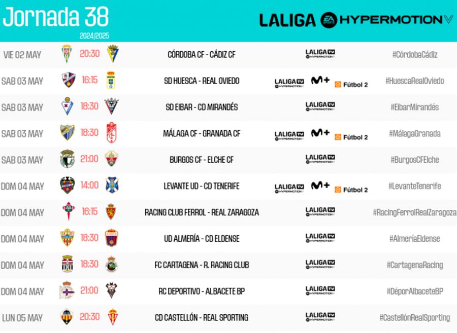 LALIGA ha hecho públicos los horarios de los partidos que componen la Jornada 38 de LALIGA HYPERMOTION, que arrancará el viernes 2 de mayo a las 20:30h., con el encuentro entre el Córdoba CF y el Cádiz CF; y acabará con el enfrentamiento del lunes 5 de mayo entre el CD Castellón y el Real […]