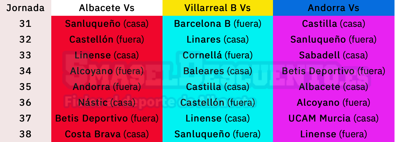 El calendario apremia. La clasificación se aprieta un poco más y Albacete, Villarreal B y Andorra de manifiestan como claros aspirantes a la primera plaza del grupo y a su ascenso directo al fútbol profesional. ¿Qué calendario tienen estos tres equipos de cara al final de temporada? Aquí, los enfrentamientos: